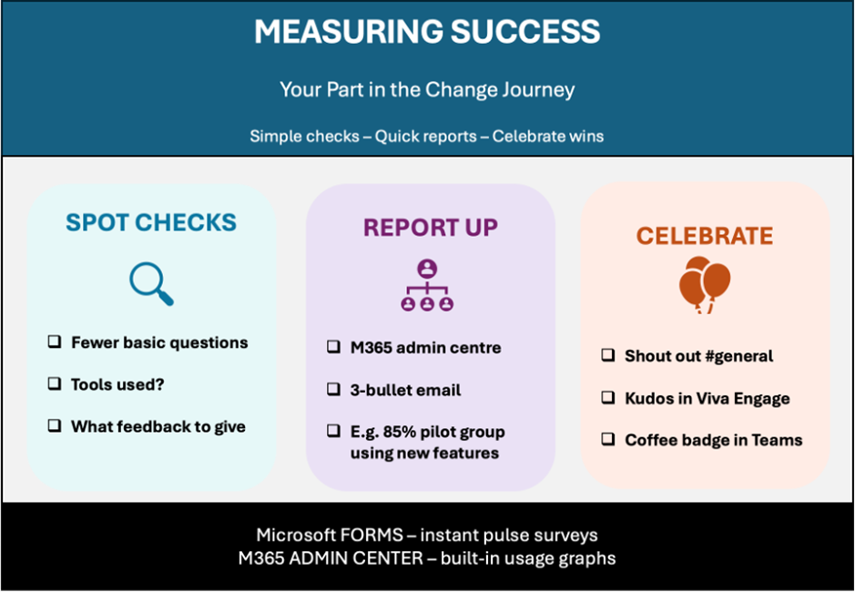 When confidence grows, the “how do I…?” questions slow down. Later, the questions often shift to “Can Teams do this?” or “What’s the best way to share this file?”, a clear sign of growing skills with your organisation. A good sign that adoption of the tools is visible is the Teams channels are busier, co-editing is taking place in SharePoint and files, not attachments, are shared as OneDrive links.