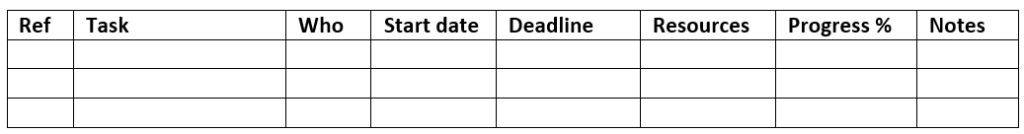 Adding columns for Ref. (a unique reference for each task), progress towards completion, and Notes will make the table even more useful.
